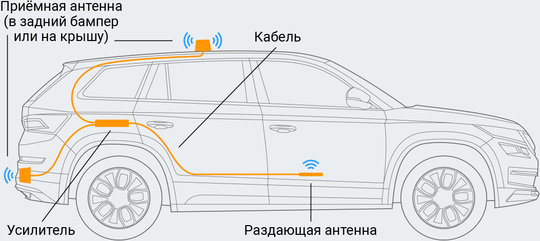 Всенаправленная внешняя антенна, которая принимает сигнал от базовой станции оператора, крепится к кузову ТС магнитным основанием. Крыша выступает естественным экраном, отражающим радиоволны на антенну. Далее сигнал поступает на репитер, усиливается и передается на излучатель, который распространяет его по салону.