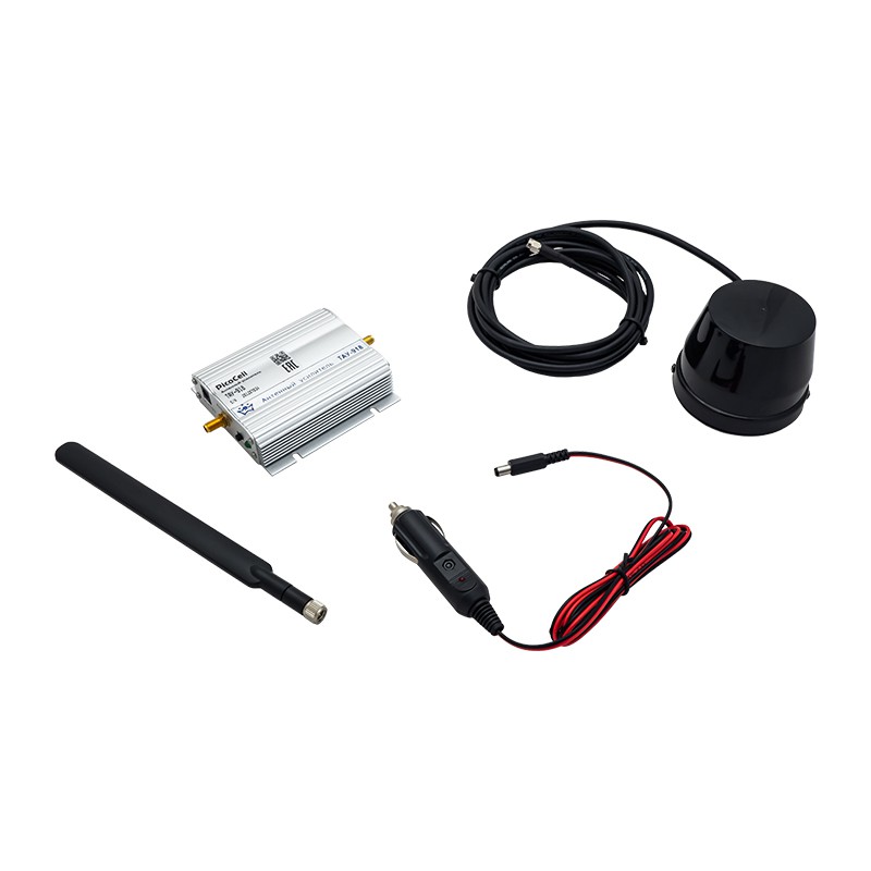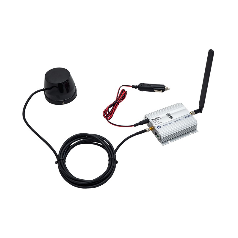 Набор состоит из антенного усилителя ТАУ, выносной уличной магнитной антенны, штыревой раздающей антенны и автомобильного адаптера питания. Усилитель поддерживает входное питание 12В и может подключаться к обычному разъему прикуривателя.