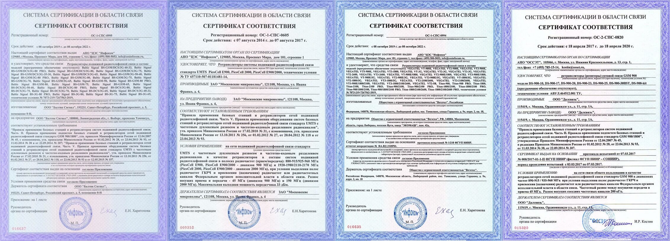 Несмотря на амбивалентный статус сотовых усилителей, Минкомсвязи осуществляет их сертификацию. На сегодня сертификат в области связи (ССС) получили все крупные российские производители репитеров, включая Baltic Signal, PicoCell, Vegatel, ДалСвязь и другие.