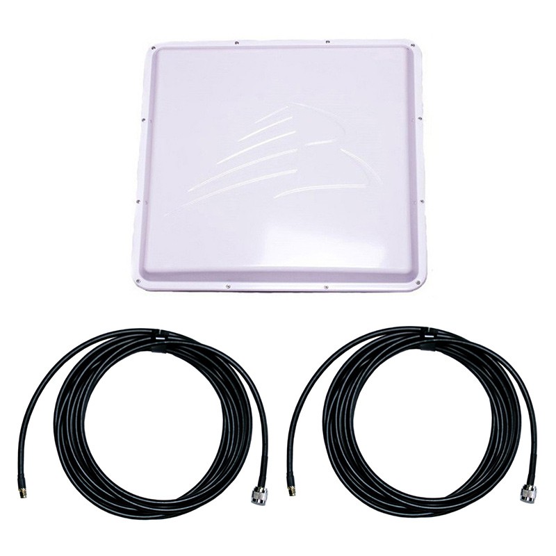 Излучатель в виде стальной решетки гарантирует коэффициент усиления до 20 дБи на каждом из двух каналов связи. Вся «начинка» располагается в квадратном пластиковом корпусе размером 45 х 45 см. Мощности устройства достаточно, чтобы принять сигнал от базовой станции, расположенной на удалении 10–15 км.