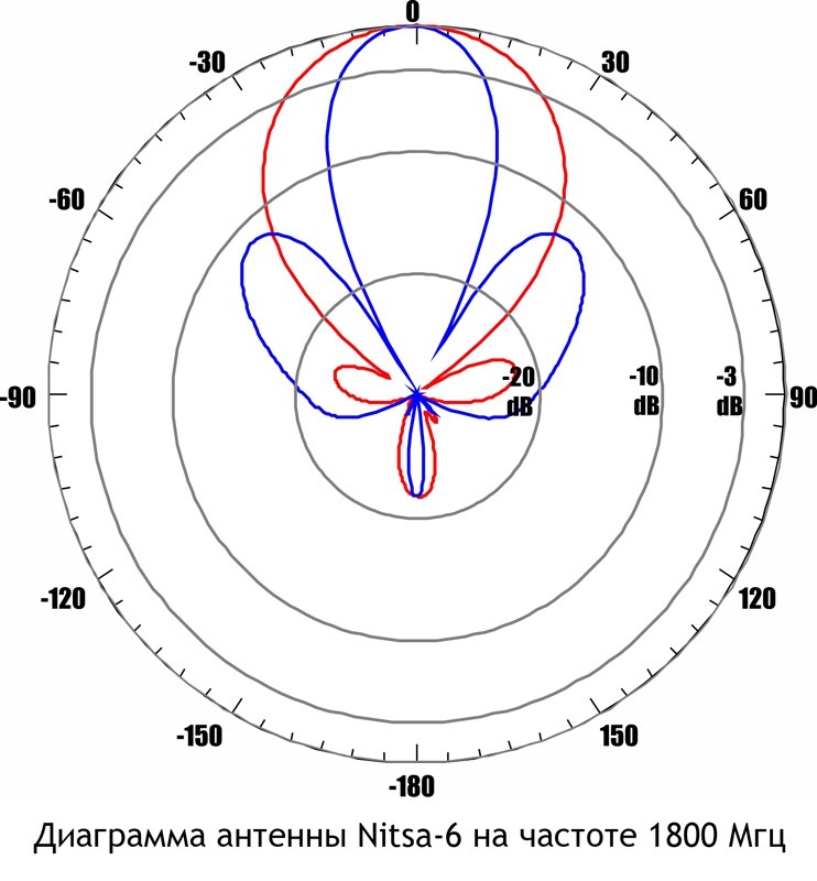 Диаграмма направленности также разнится в зависимости от частоты сигнала. Для 900 МГц у данной антенны она около 60 градусов, для 1800 МГц - 30 градусов.