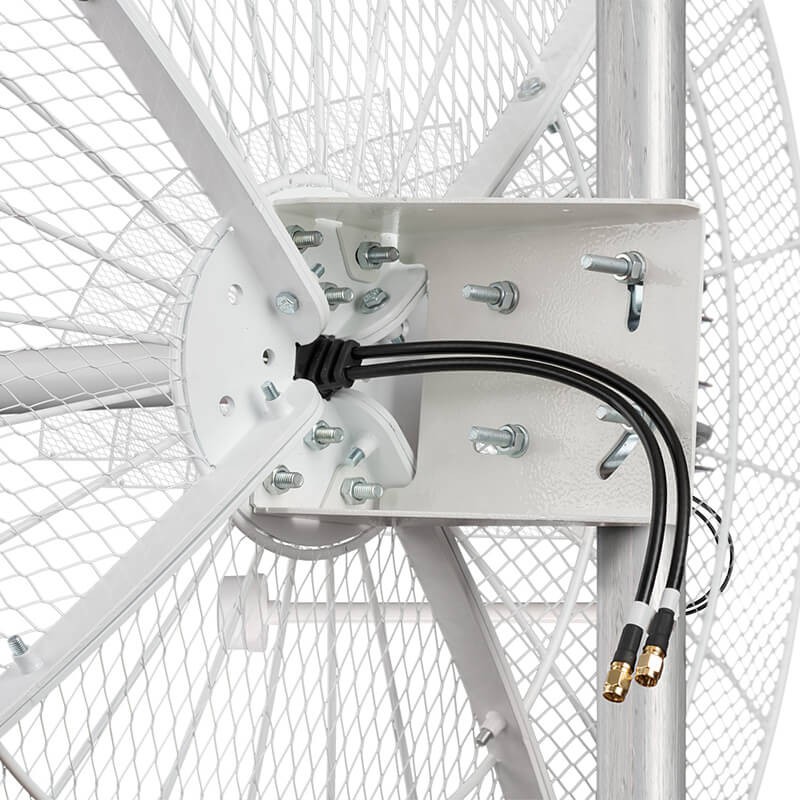Подключение к конечному устройству производится при помощи двух отрезков кабеля с разъемами SMA-male, которые выходят с задней стороны стойки облучателя. Антенна может быть подключена к совместимому модему или роутеру (соединительные кабели нужной длины приобретаются отдельно). Два разъема используются для поддержки технологии MIMO, которая увеличивает скорость интернет-соединения за счет передачи данных в двух независимых каналах, отличающихся поляризацией сигнала.