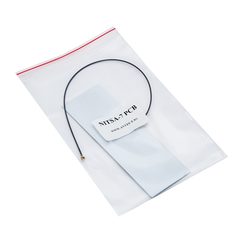 Nitsa-7 PCB исполнена в форм-факторе печатной платы размером 120 x 140 x 1 мм и весом всего 5 г. Низкопрофильный разъем U.FL закреплен на конце тонкого гибкого кабеля длиною 20 см. Антенна не имеет какого-либо способа крепления: производитель подразумевает монтаж при помощи двустороннего скотча.