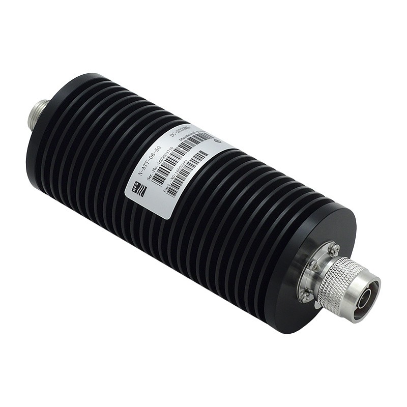 RFS N-ATT-06-50 — аттенюатор для внесения затухания 6 дБ в высокочастотные системы, работающие в диапазоне от 0 до 3 ГГц, такие как усилители сотовой связи и точки доступа WiFi. Рабочие частоты аттенюатора обеспечивают совместимость устройства с репитерами сетей GSM, 3G и 4G, а также с различным активным WiFi-оборудованием (2,4 ГГц). Максимальная мощность — 50 Вт.