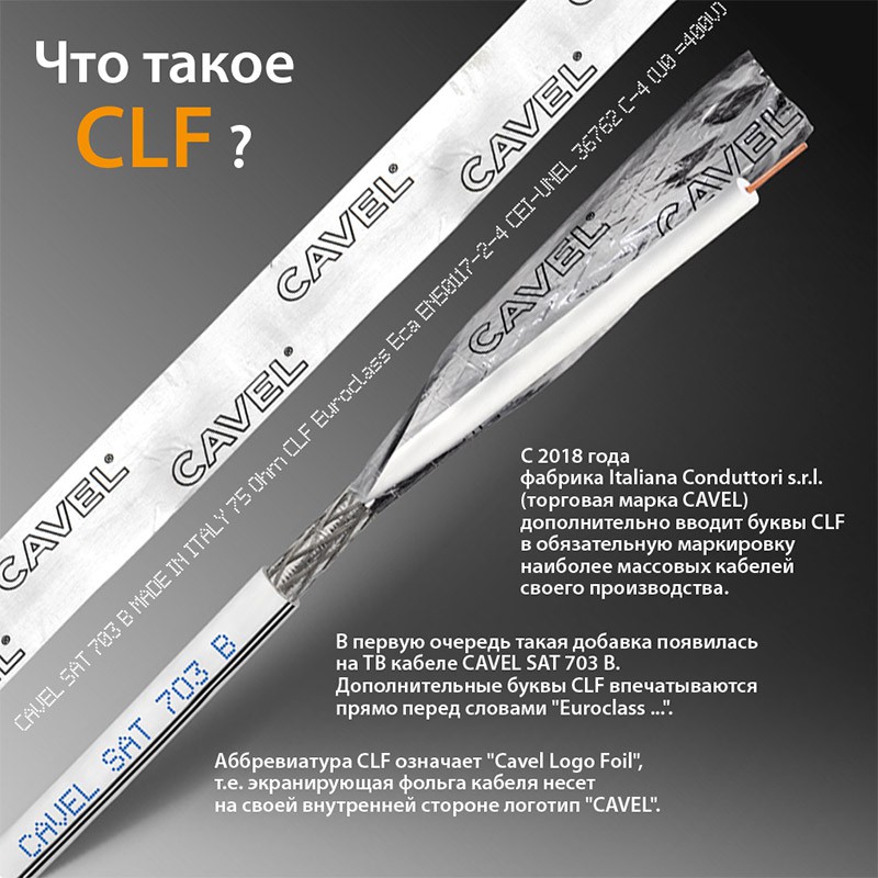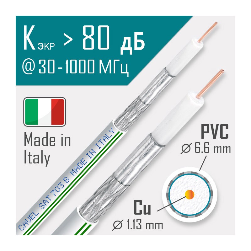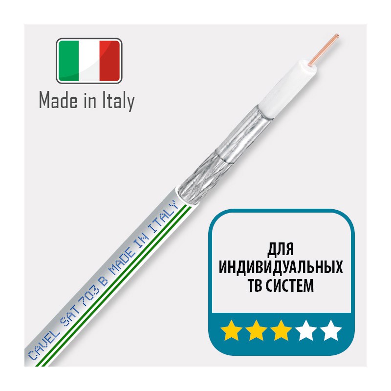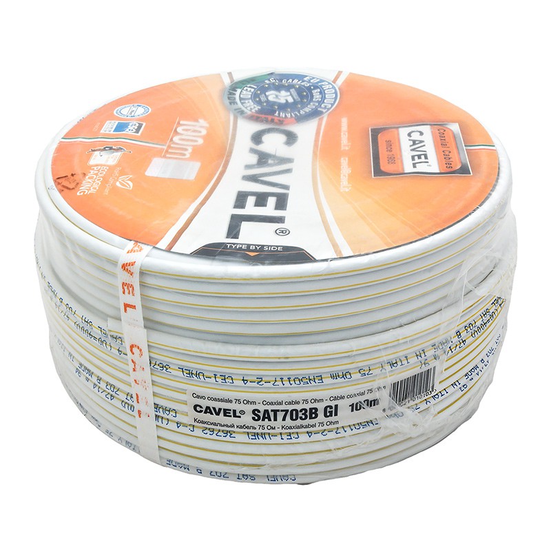 Высококачественный телевизионный кабель Sat-703B итальянского производства (фирма Cavel). Сохраняя высокую степень гибкости, кабель марки Sat-703 обеспечивает высокое качество передачи видео- и аудиосигнала в жилых и производственных помещениях. Sat-703 часто применяется для подключения эфирных и спутниковых антенн, а также кабельного ТВ к абонентскому оборудованию — телевизорам, ресиверам и т. п.