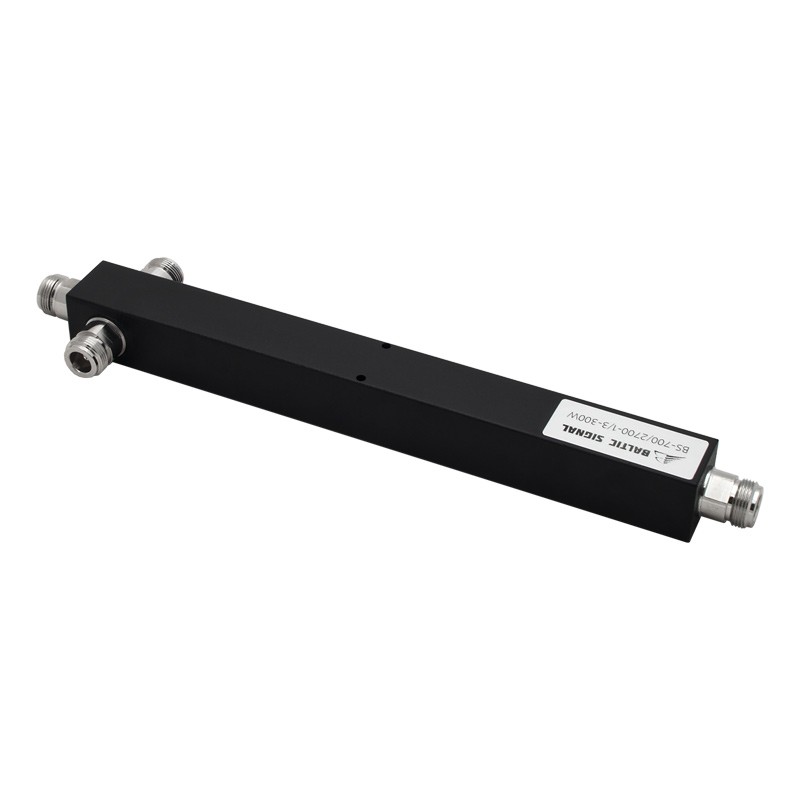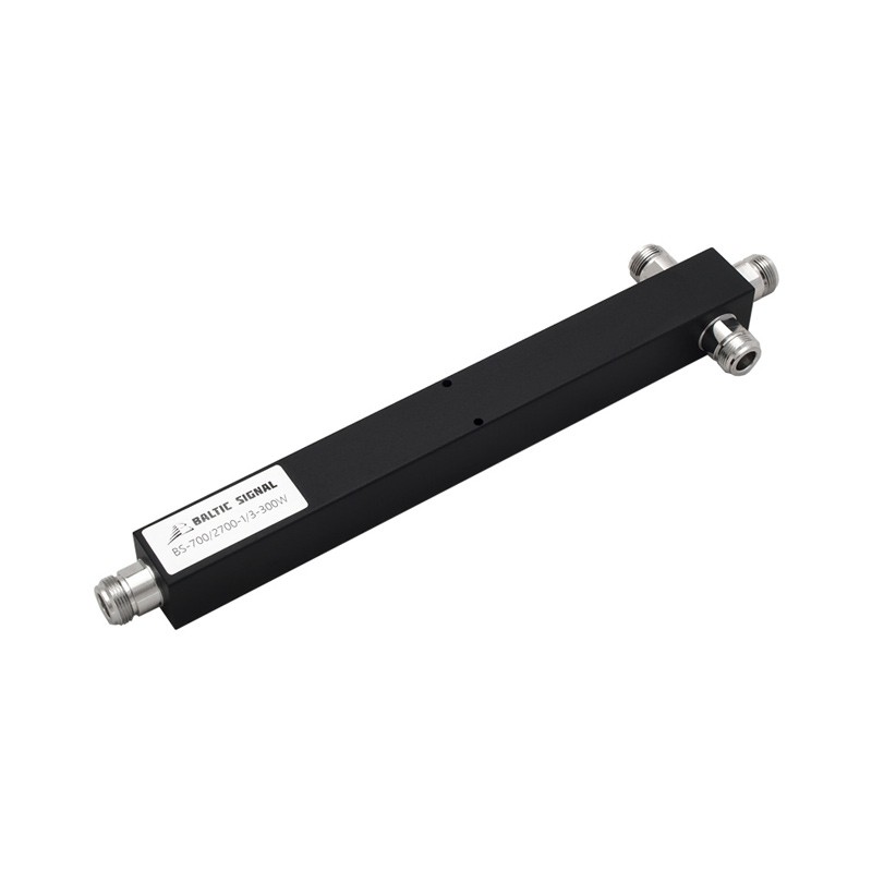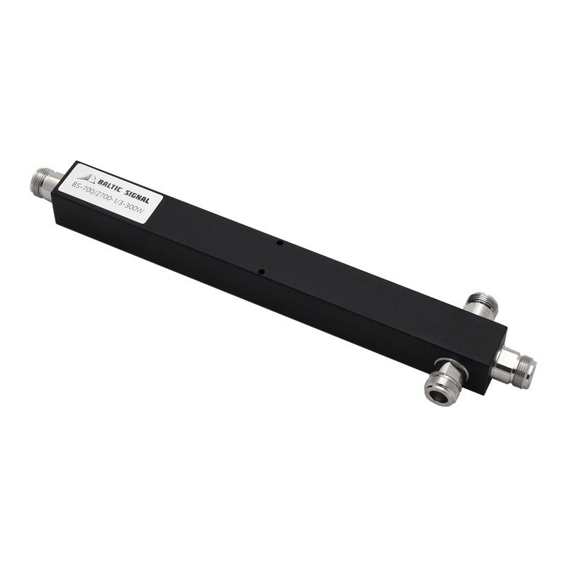 BS-700/2700-1/3-300W выполнен в цельном металлическом корпусе. Потери на делении составляют 5 дБ, то есть выходной сигнал на каждом разъеме в 3 раза слабее входного. Все разъемы — N-female.