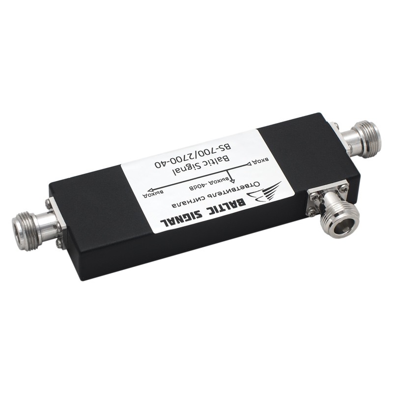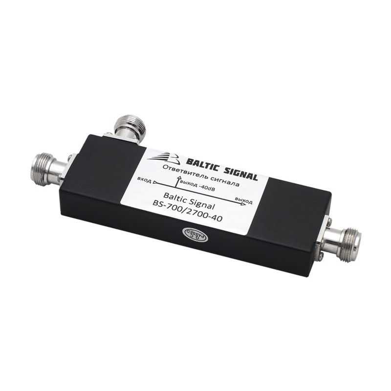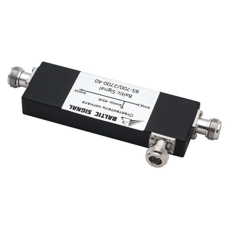 BS-700/2700-40 — неравномерный делитель ВЧ-сигнала на две части от отечественного производителя Baltic Signal. Ослабление сигнала на боковом выходе составляет 40 дБ, то есть поступающий на него сигнал будет в 10000 раз слабее основного (магистрального).
