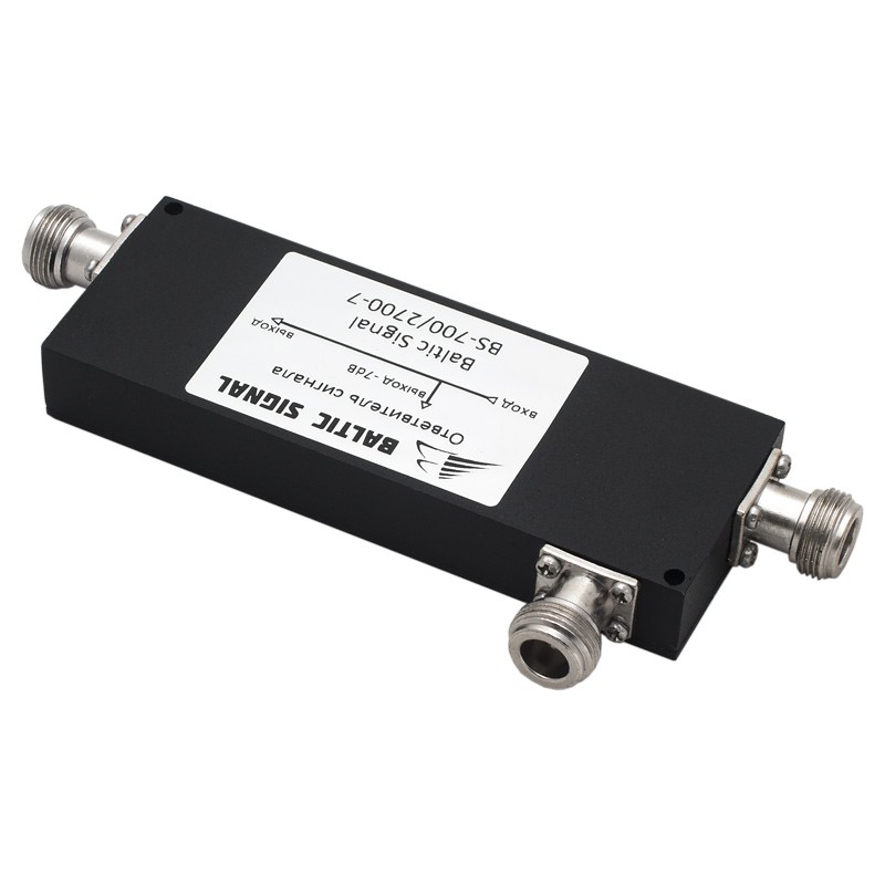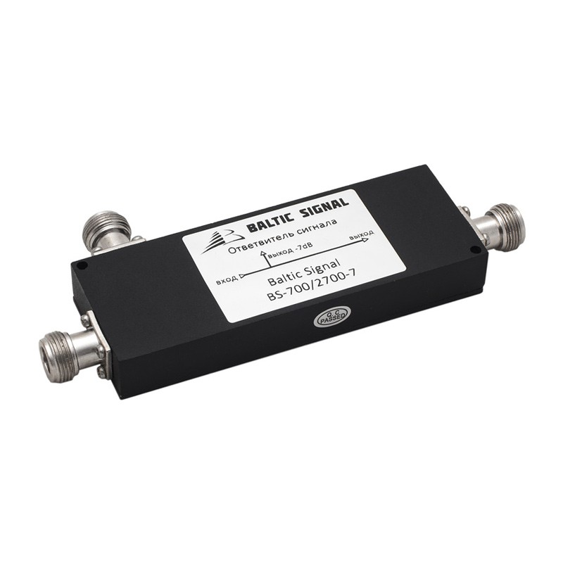 BS-700/2700-7 — неравномерный делитель ВЧ-сигнала на две части от отечественного производителя Baltic Signal. Ослабление сигнала на боковом выходе составляет 7 дБ, то есть поступающий на него сигнал будет в 5 раз слабее основного (магистрального).