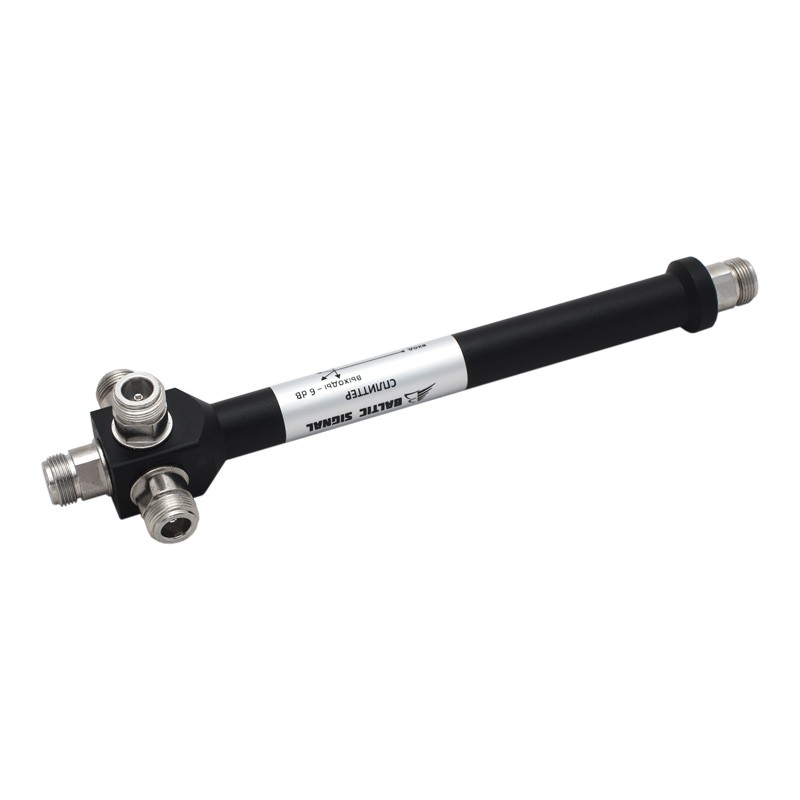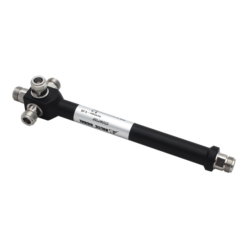 Данная модель исполнена в монолитном металлическом корпусе. Затухание на выходах составляет -6 дБ, то есть выходной сигнал в 4 раза слабее входного. Все разъемы — N-female.