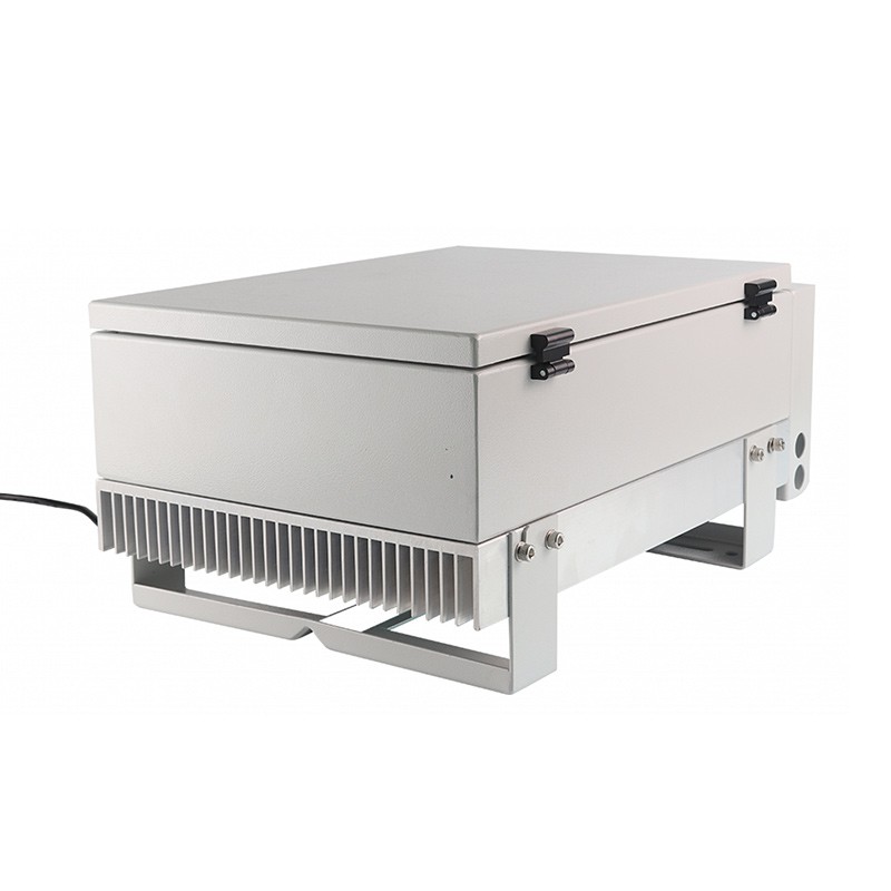 В нижней части репитера имеется кабель питания, ВЧ-коннекторы типа N-female и рычаг включения. Массивное оребрение на задней поверхности эффективно рассеивает тепло и поддерживает рабочую температуру внутри защитного корпуса. Замки, закрывающие внешнюю дверцу корпуса, надежно защищают устройство от внешнего вмешательства.