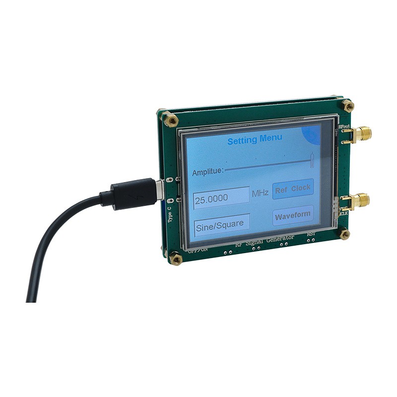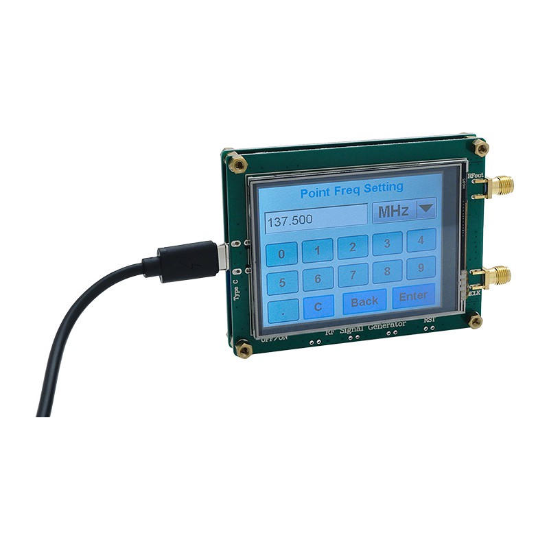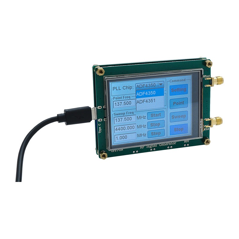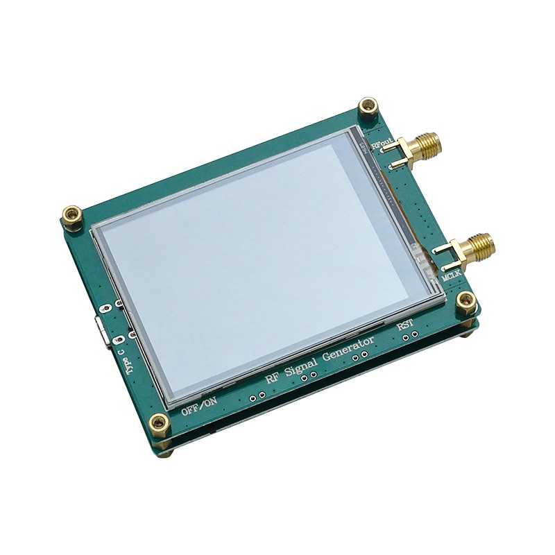 Генератор ВЧ-сигнала, применяемый для тестирования и калибровки различных электронных систем и радиокомпонентов. Благодаря элементарной базе, содержащей чип-синтезатор ADF4351, устройство способно генерировать сигнал на частоте от 35 МГц до 4,4 ГГц.