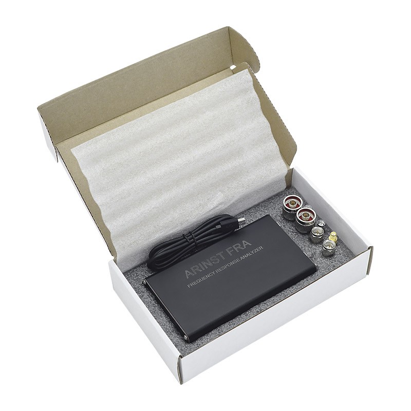 | Комплектация | измеритель Arinst FRA, кабель Mini-USB — USB, два пигтейла SMA-male (прямой) — SMA-male (угловой), два пигтейла SMA-male (угловой) — SMA-male (угловой), два переходника SMA-female — N-male, два переходника SMA-female — F-male, переходник SMA-female — SMA-female, два аттенюатора 10 дБ, инструкция |