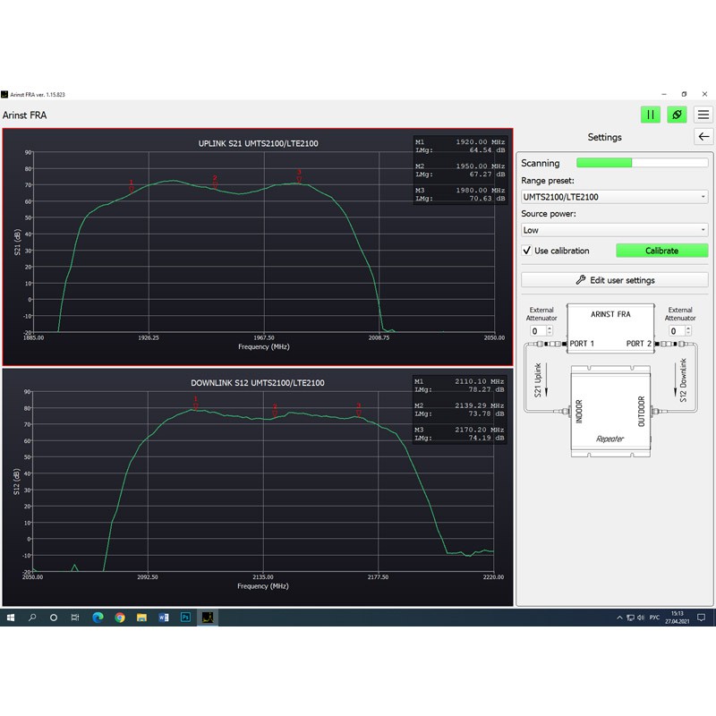 Программно-аппаратный комплекс Arinst FRA подходит для измерения характеристик репитеров разной мощности. При необходимости измерить амплитудно-частотные характеристики усилителя мощностью свыше 200 мВт (23 дБм) необходимо использовать аттенюаторы 10 дБ, включенные в комплект поставки.