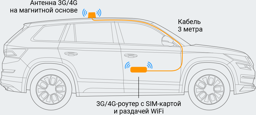 Антенна устанавливается на крышу или в салон машины, обеспечивая более уверенный приём сигнала 3G/4G. Это значит, что интернет-соединение будет стабильнее и быстрее. Модем (роутер) создаёт WiFi-зону в автомобиле для водителя и пассажиров.