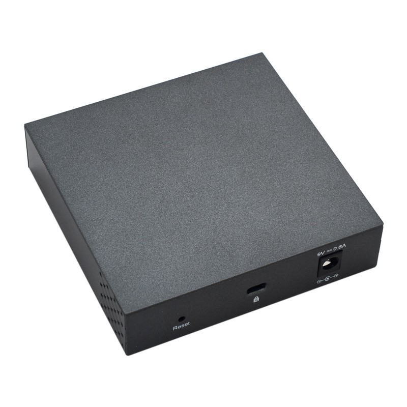 Коммутатор выполнен в легком и компактном металлическом корпусе. Блок питания подключается к устройству через стандартный DC-разъем. Возможно крепление коммутатора на стене. Для настольного использования в комплекте имеются самоклеющиеся ножки. Также на коммутаторе предусмотрен кенсингтонский замок, усложняющий его кражу.