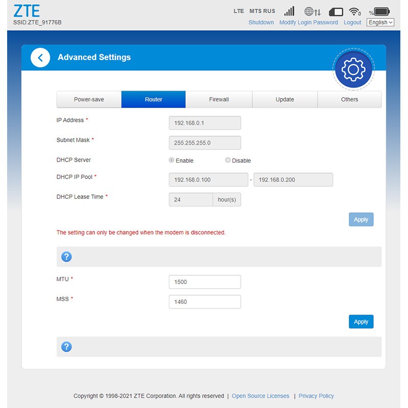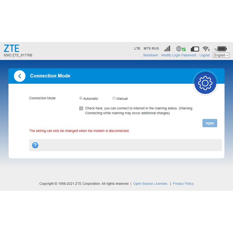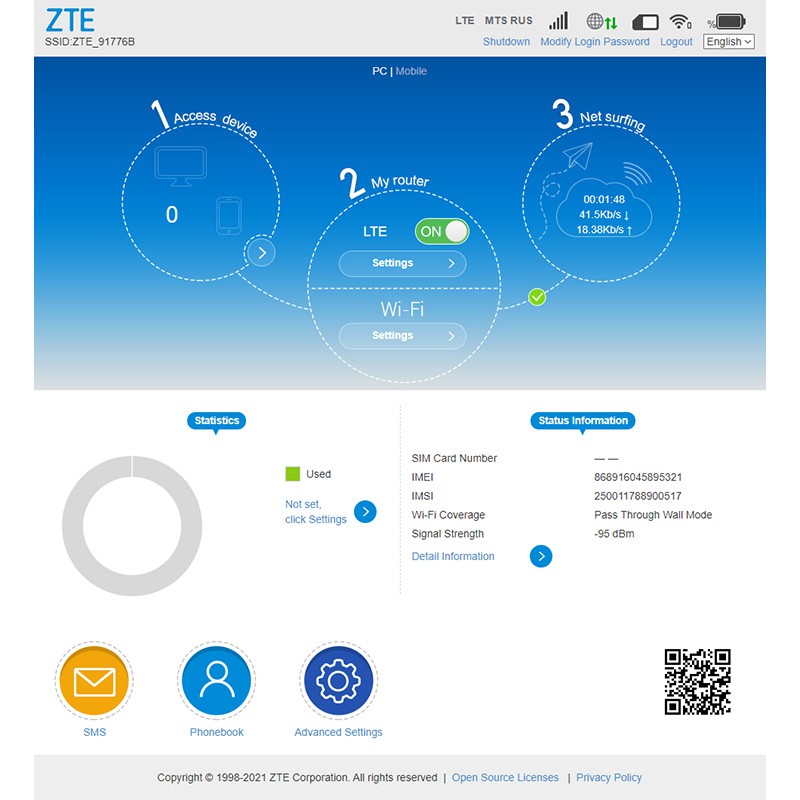Настройка MF79U отличается простотой и интуитивной понятностью. Порядок подключения и эксплуатации модема подробно описан в комплектной документации. Стандартный веб-интерфейс ZTE удобен и практичен. Обратите внимание: данные для доступа в веб-интерфейс модема напечатаны на наклейке, находящейся на коробке. Не выбрасывайте упаковку модема сразу после приобретения устройства, так как иначе вы утратите доступ к панели управления!
