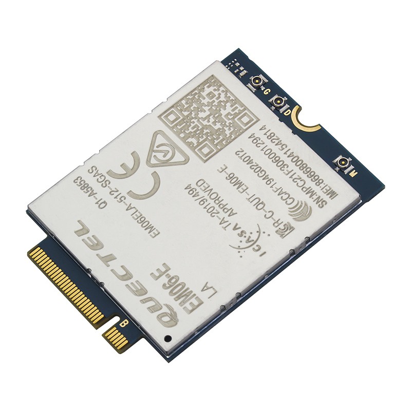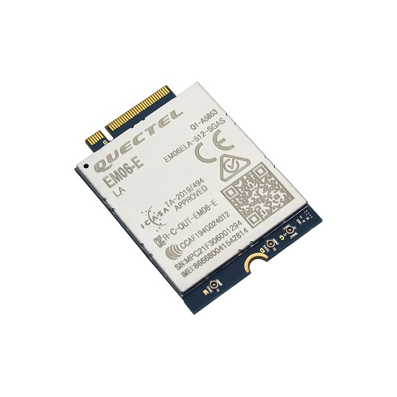 Quectel EM06-E — сотовый модуль с поддержкой агрегации частот (LTE Cat. 6), работающий со скоростью 300 Мбит/с на загрузку и 50 Мбит/с на передачу. Модем выполнен в виде платы M.2 и обычно используется с управляющим устройством или USB-переходником. Стабильное качество, подробная документация и качественная поддержка зарекомендовали продукцию Quectel как надежные решения для индустриальных M2M-приложений и бытовых устройств связи.