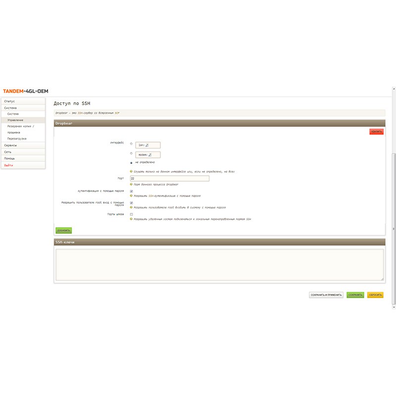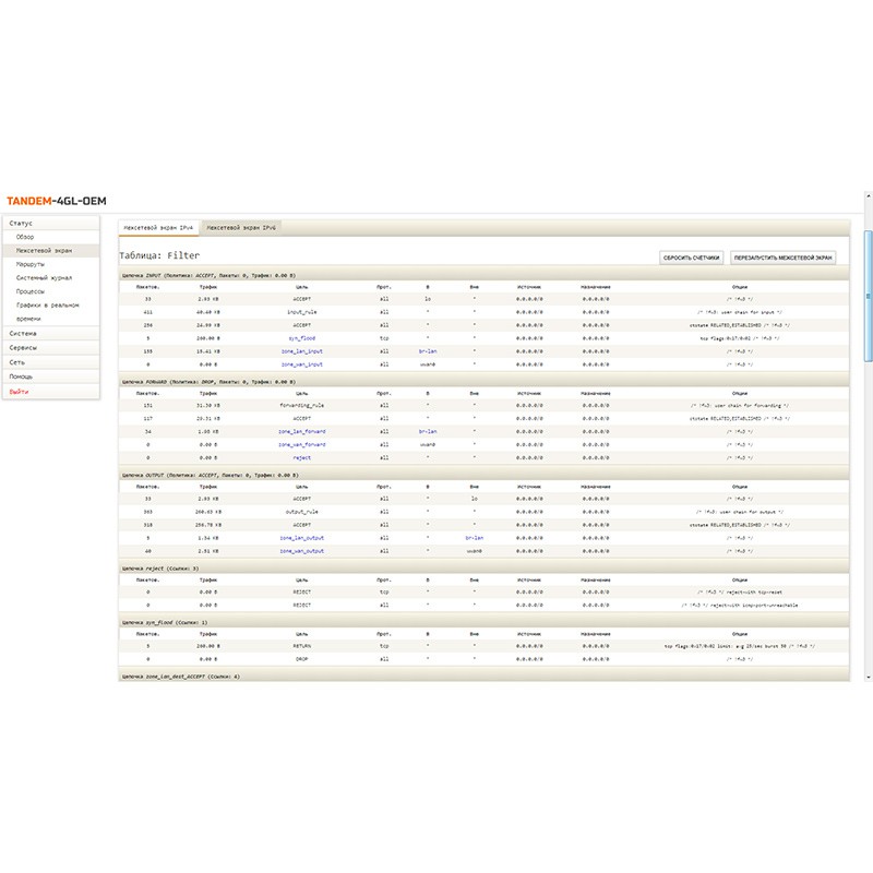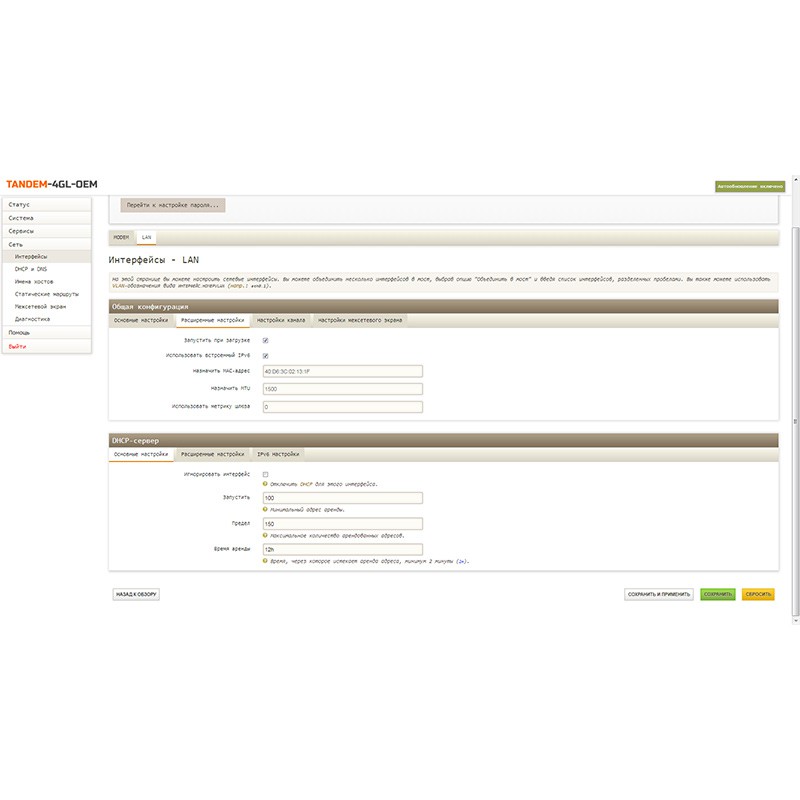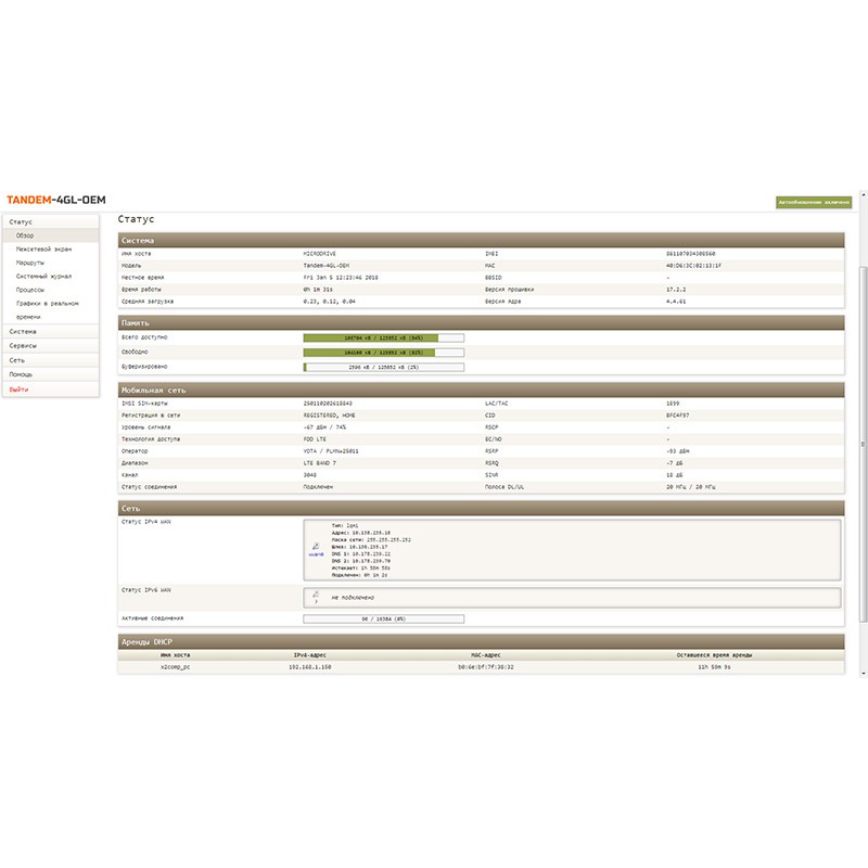 Операционная система Tandem-4GL основана на платформе LEDE/OpenWRT и изначально поставляется с дополнительными пакетами, расширяющими функциональность устройства. Веб-интерфейс Tandem-4GL полностью русифицирован и отличается обилием параметров, позволяющих детально настроить локальную сеть и маршрутизацию. Поддерживается большинство современных протоколов и служб, включая NAT, DHCP, DNS, SSH, NTP, TFTP, PPP, IPv4, IPv6, ICMP, IGMP, IGRP, ARP и др.