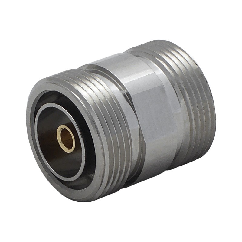 Переходник с двумя разъемами DIN 7/16 («мама») для соединения между собой фидерных кабельных сборок. Чаще всего он используется для коммутации антенного оборудования и радиоустройств в составе базовых станций операторов. Также адаптеры DIN применяются в системах усиления сотовой связи на объектах большой площади. Эта модель может использоваться для передачи сигнала частотой 0–6000 МГц высокой мощности.