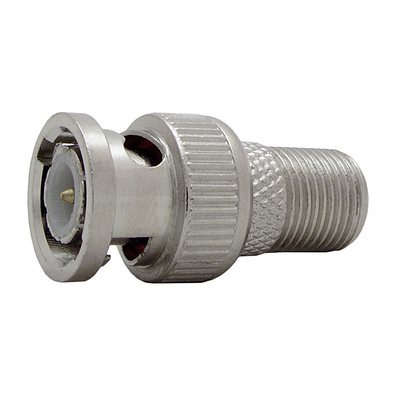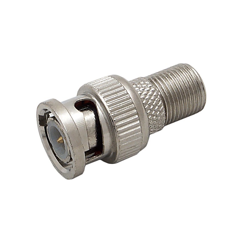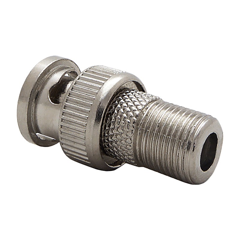 Переходник с разъема BNC-male (вилка) на F-female (розетка), позволяющий добиться совместимости оборудования и кабельных сборок. Разъемы F-типа чаще всего используются в сфере кабельного и спутникового телевидения, а BNC — в видеонаблюдении и специальных измерительных приборах (осциллографах). Нередко разъемы такого типа встречаются в устройствах радиолюбителей.