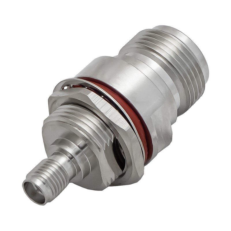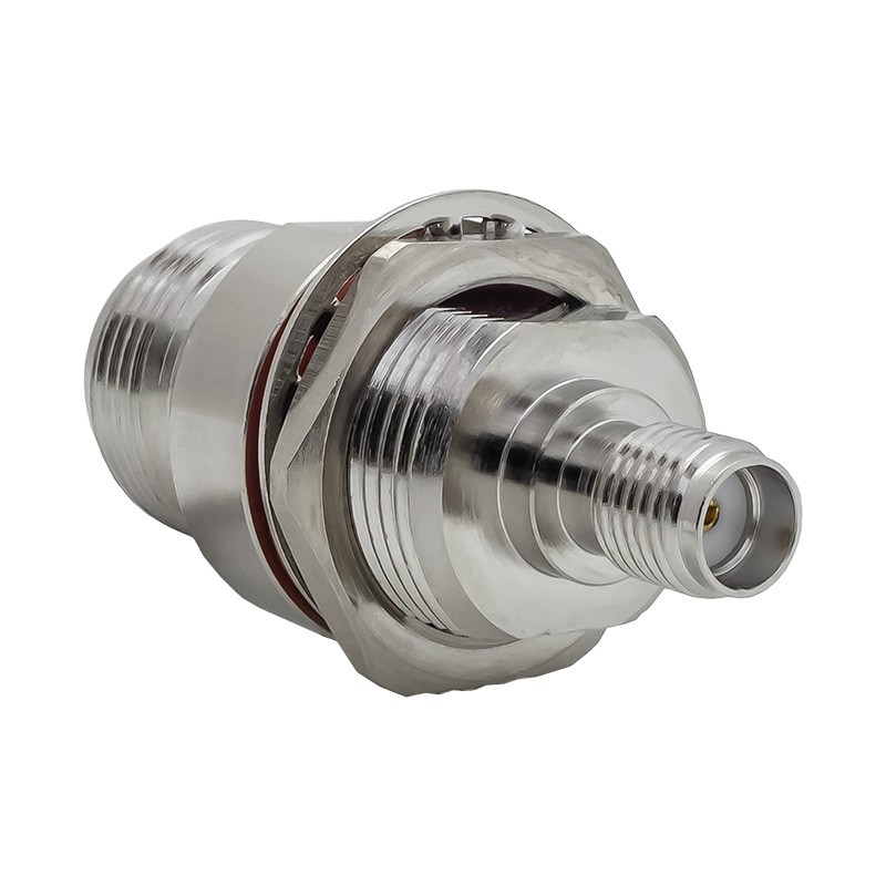 Высокочастотный переходник с разъемами N-female и SMA-female для обеспечения совместимости различных компонентов ВЧ-систем. Эта версия адаптера SN-322 имеет приборное исполнение с дополнительной гайкой, позволяющей закрепить переходник на корпусе какого-либо устройства.