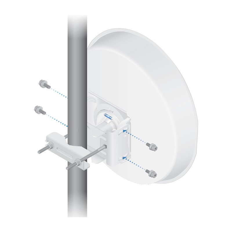Точка доступа PowerBeam 5AC ISO Gen2 предназначена для установки на столбах и мачтах диаметром 40–80 мм, при этом все необходимые для монтажа компоненты входят в комплект поставки. Сборка системы предельно простая и не требует специальных инструментов, за исключением гаечного ключа диаметром 13 мм. Штатный узел крепления PowerBeam имеет возможность регулировки наклона антенны вверх и вниз на 20°.