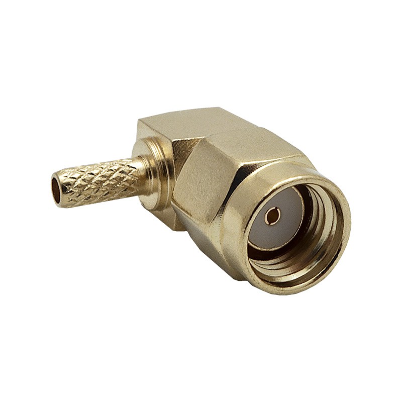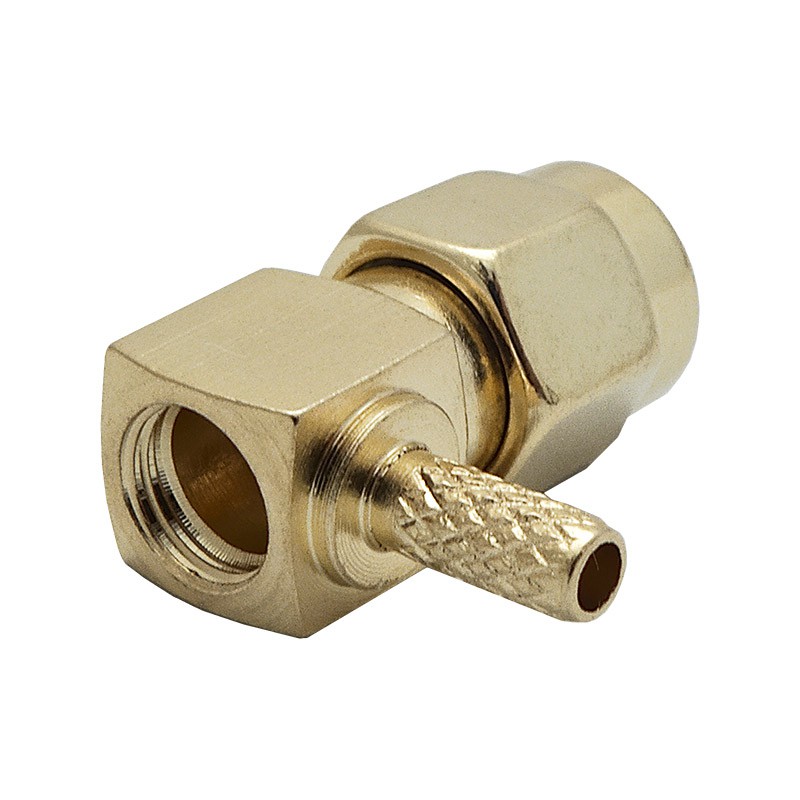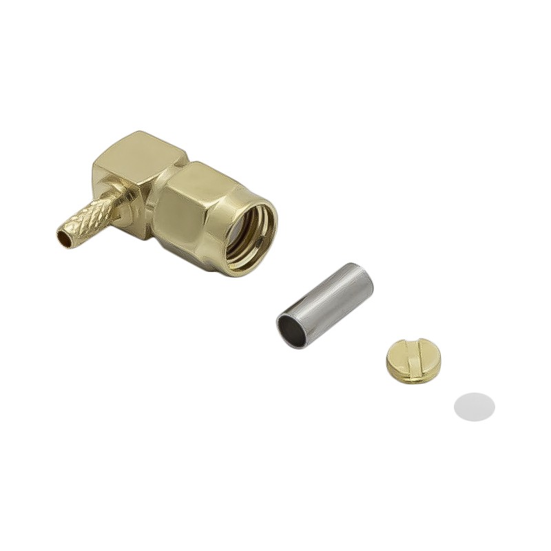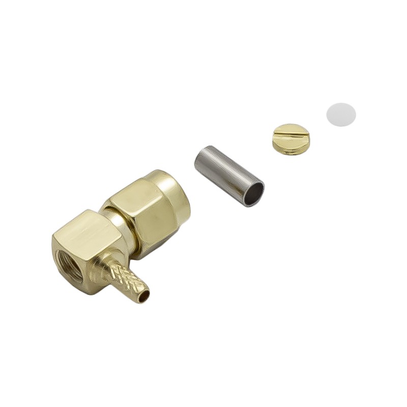 Обжимной разъем для тонких коаксиальных кабелей RG-174 и RG-316. Коннектор S-A121L имеет угловое исполнение корпуса, монтаж центрального контакта осуществляется пайкой.