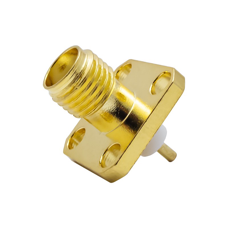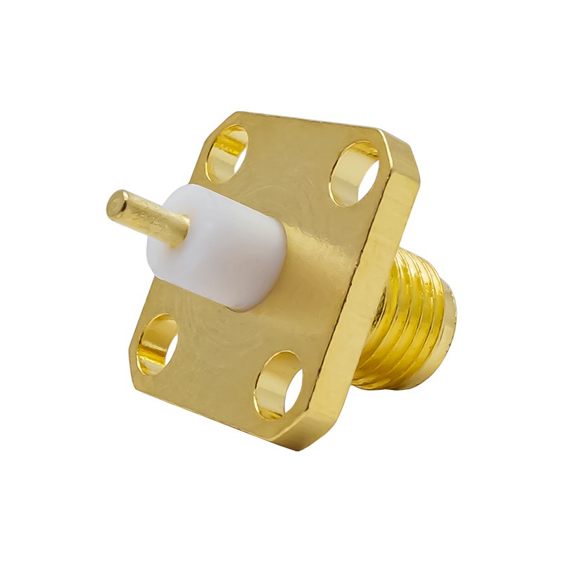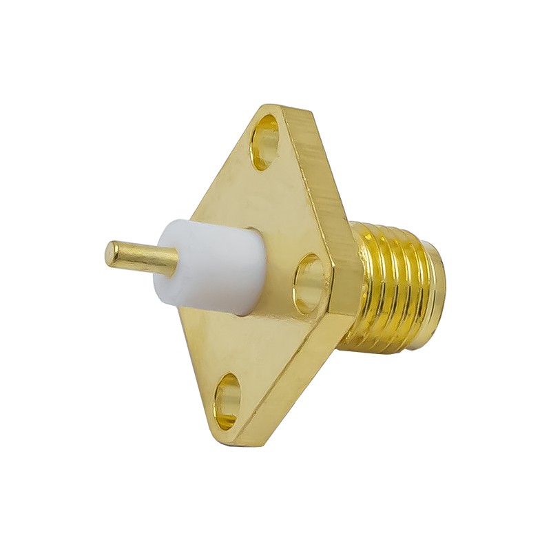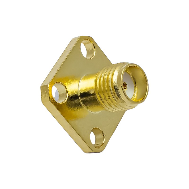 Приборный разъем SMA-female с фланцевым креплением на 4 винта. Коннектор предназначен для монтажа на корпус устройств с последующей пайкой центрального контакта. Коннекторы этого типа используются при производстве приборов, требующих надежной фиксации разъема на корпусе.