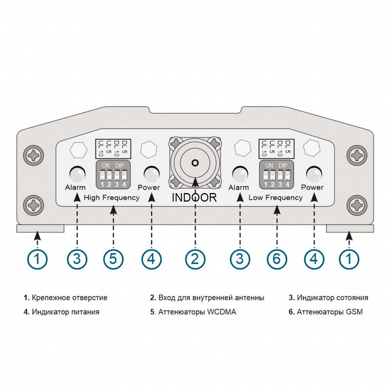 При перегрузке ретранслятора/репитера (сигнал от базовой станции слишком велик) светодиодный индикатор ALARM меняет зеленый или оранжевый цвет свечения на красный. В этом случае уменьшите коэффициент усиления ретранслятора, а если этого недостаточно, измените ориентацию направленной в сторону базовой станции наружной антенны до погасания красного индикатора перегрузки.