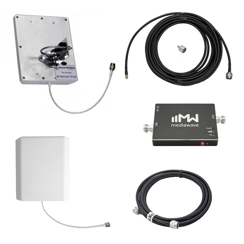 В основе комплекта используется активный усилитель мобильного сигнала — репитер начального уровня MediaWave MWS-EG-B23. Эта модель имеет коэффициент усиления 65 дБ и отлично подходит для повышения качества голосовой связи на площади до 200 м2 в квартирах, офисах, небольших частных домах и на дачах.