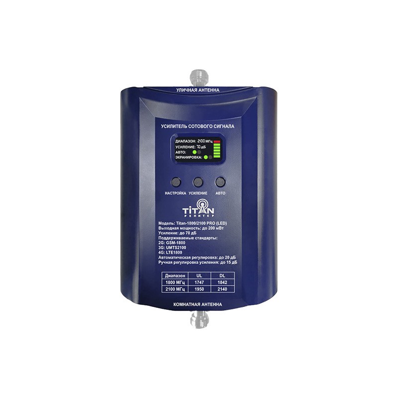 Работа со стандартами GSM-1800, LTE1800 и UMTS-2100 позволяет усилить обычную голосовую связь, интернет и голосовое общение по технологии 3G, а также мобильный 4G-интернет в диапазоне 1800 МГц. Коэффициент усиления 65 дБ и выходная мощность 200 мВт обеспечивают покрытие усиленным сигналом площади до 400 м2. Максимальный размер зоны покрытия достигается за счет высокой мощности входящего сигнала, параметров самого репитера, а также планировки здания. Усилитель Titan-1800/2100 PRO имеет автоматическую и ручную регулировку мощности сигнала, встроенную защиту от перегрузок и три индикатора активности на передней панели.