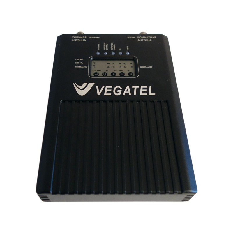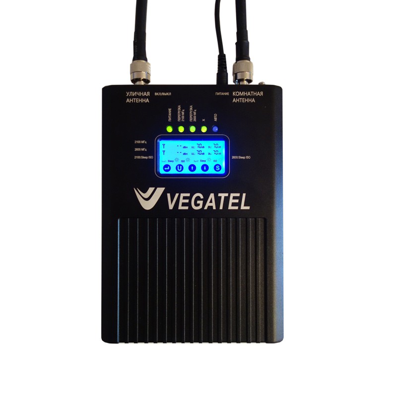 Как и все новые модели репитеров от Vegatel, VT2-3G/4G выполнен в элегантном металлическом корпусе черного цвета и оснащен сенсорным ЖК-дисплеем, с помощью которого осуществляется настройка усиления. LED-индикаторы указывают на состояние питания, перегрузки (для каждого диапазона) и работы автоматической системы.