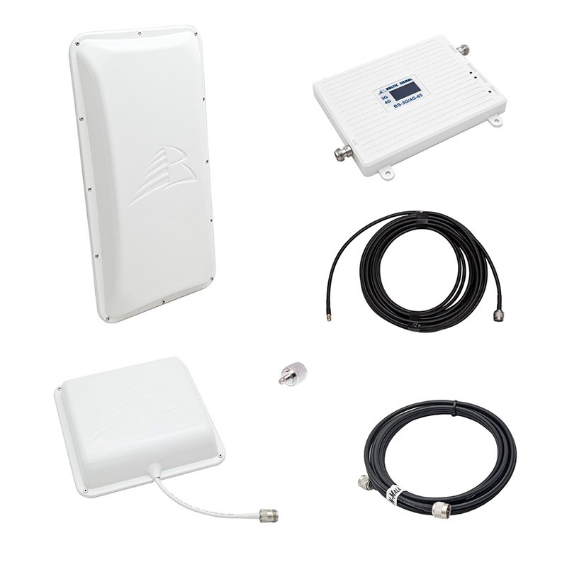 - Репитер повышает мощность сигнала, принятого уличной антенной. В набор входит репитер Baltic Signal BS-3G/4G-65 с коэффициентом усиления 65 дБ и максимальной выходной мощностью 20 дБм (100 мВт). Устройство оснащено ЖК-дисплеем с индикатором уровня сигнала, руководствуясь которым вы сможете быстро и легко настроить положение уличной антенны.