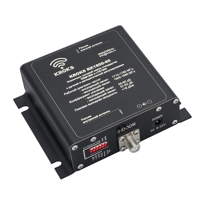 Репитер RK1800-60 F — однодиапазонный усилитель частоты 1800 МГц, обладающий коэффициентом усиления 60 дБ и выходной мощностью 18 дБм (63 мВт). Заявленные характеристики обеспечивают уверенную ретрансляцию сигнала на площади 100 м2 (при использовании комплектных антенн).