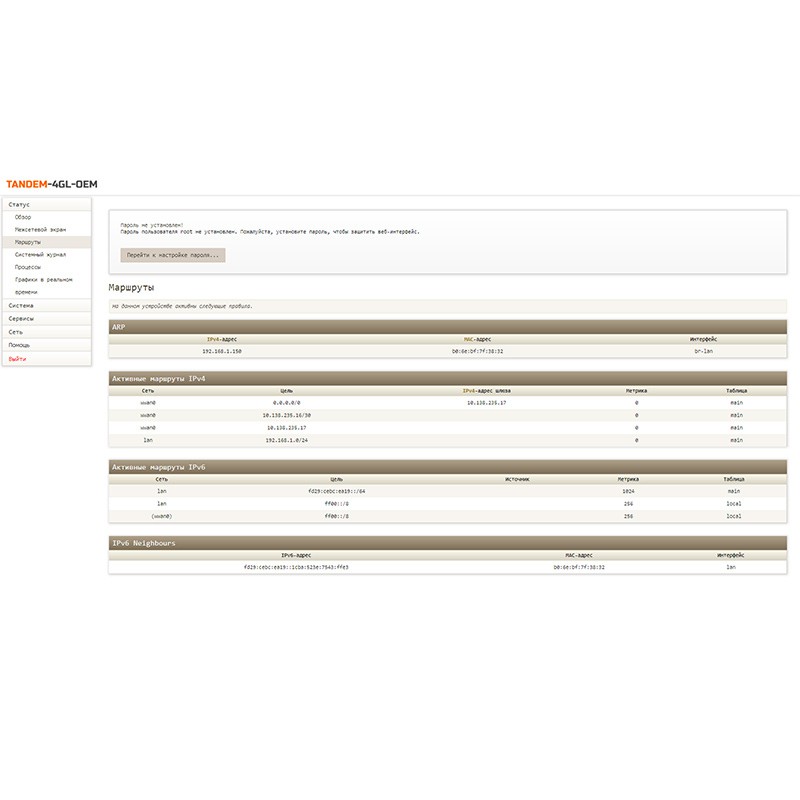 Операционная система Tandem-4GL основана на платформе LEDE/OpenWRT и изначально поставляется с дополнительными пакетами, расширяющими функциональность устройства. Веб-интерфейс Tandem-4GL полностью русифицирован и отличается обилием параметров, позволяющих детально настроить локальную сеть и маршрутизацию. Поддерживается большинство современных протоколов и служб, включая NAT, DHCP, DNS, SSH, NTP, TFTP, PPP, IPv4, IPv6, ICMP, IGMP, IGRP, ARP и др.