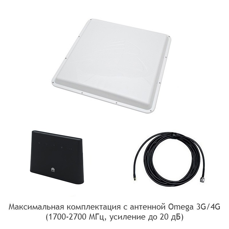 - Максимальная комплектация (антенна OMEGA 3G/4G). Антенна OMEGA 3G/4G имеет очень высокий коэффициент усиления (до 20 дБи) и используется, чтобы обеспечить быстрый и стабильный мобильный интернет даже при слабом входящем сигнале. Рабочий диапазон частот — 1700–2700 МГц.