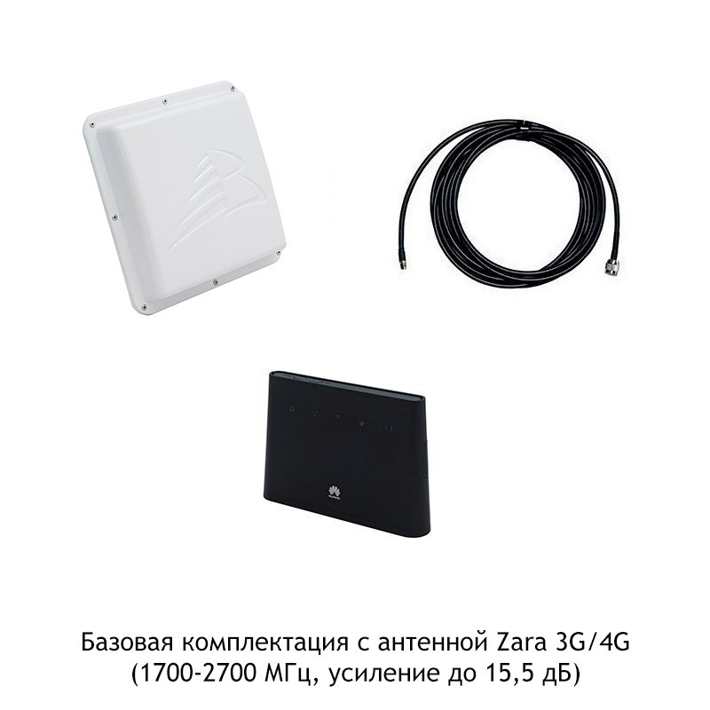 - Стандартная комплектация (антенна Zara 3G/4G). Уличная антенна Zara 3G/4G работает в диапазоне частот 1700–2700 МГц и имеет коэффициент усиления 13–15 дБи. Эта модель позволяет принимать и передавать сигнал распространенных стандартов 3G/4G-связи и рекомендуется для использования в городах и пригородах.