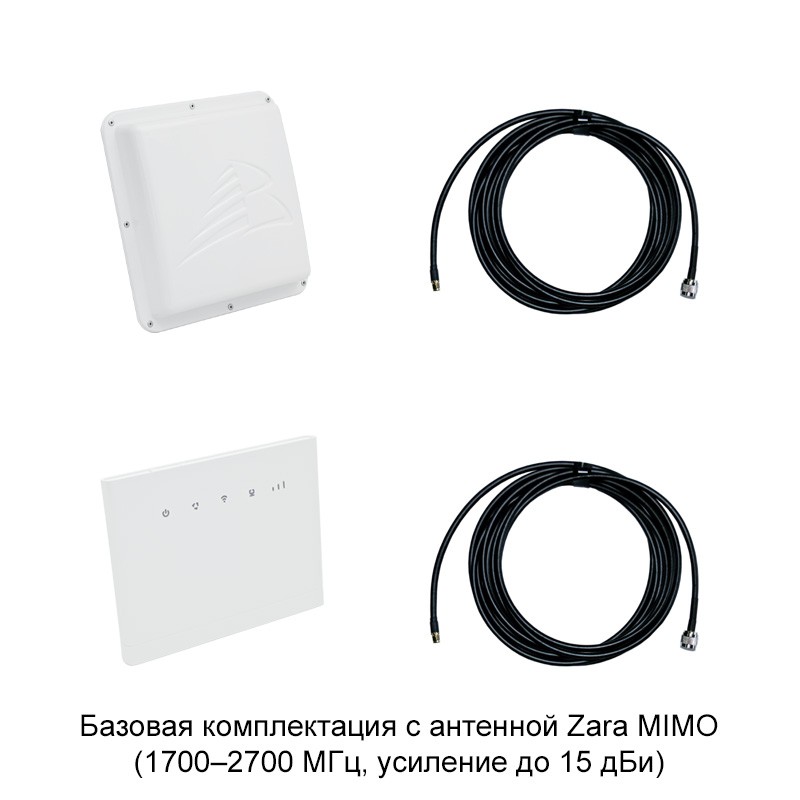 - Стандартная комплектация с моделью Zara MIMO. Антенна имеет коэффициент усиления 12,5–15 дБи и работает с сигналом в диапазоне от 1700 до 2700 МГц (большинство стандартов 3G и 4G);