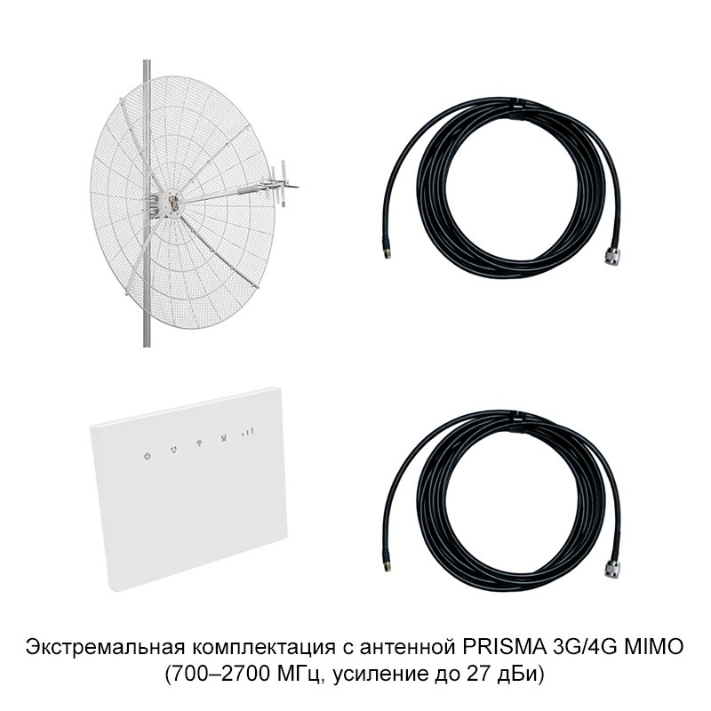 - Экстремальная комплектация с моделью PRISMA 3G/4G MIMO. Параболическая конструкция с отражателем Ø1 м может принять устойчивый сигнал там, где другие виды антенн бессильны. Усиление до 27 дБи. Облучатель поддерживает как нижние, так и высокие частоты сотовой связи (790–960 МГц и 1700–2700 МГц).