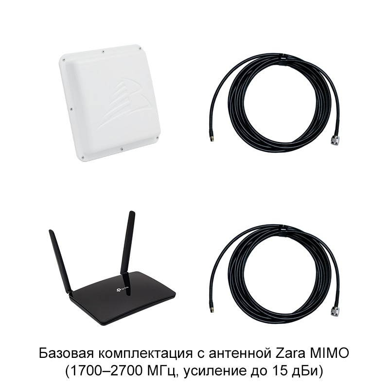 - Стандартная комплектация — Zara MIMO. Этот вариант поставки подходит для городов, пригородов и загородной местности при уверенном сотовом сигнале на улице. Антенна работает в диапазоне частот 1700–2700 МГц и имеет усиление до 15,5 дБи;