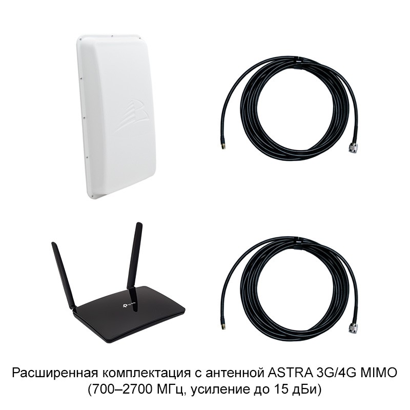 - Расширенная комплектация — ASTRA 3G/4G MIMO. Антенна поддерживает двойной диапазон частот: 1700–2700 МГц и 790–960 МГц. Эта комплектация рекомендуется для дачных и коттеджных поселков и сельской местности, где операторы могут использовать низкие частоты;
