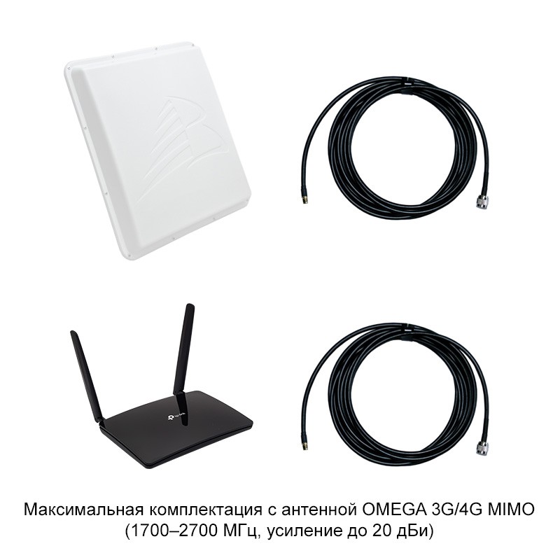 - Максимальная комплектация — OMEGA 3G/4G MIMO. Благодаря большой площади, антенна имеет повышенное усиление 18–20 дБи и может принимать сигнал на границе мобильной сети;