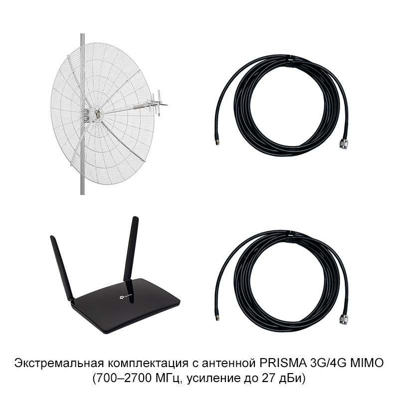 - Экстремальная комплектация — PRISMA 3G/4G MIMO. Параболическая конструкция антенны обеспечивает усиление до 27 дБи и стабильную работу в наиболее сложных и удаленных районах нашей страны (на расстоянии 20+ км от базовой станции). Поддерживаются все частоты.