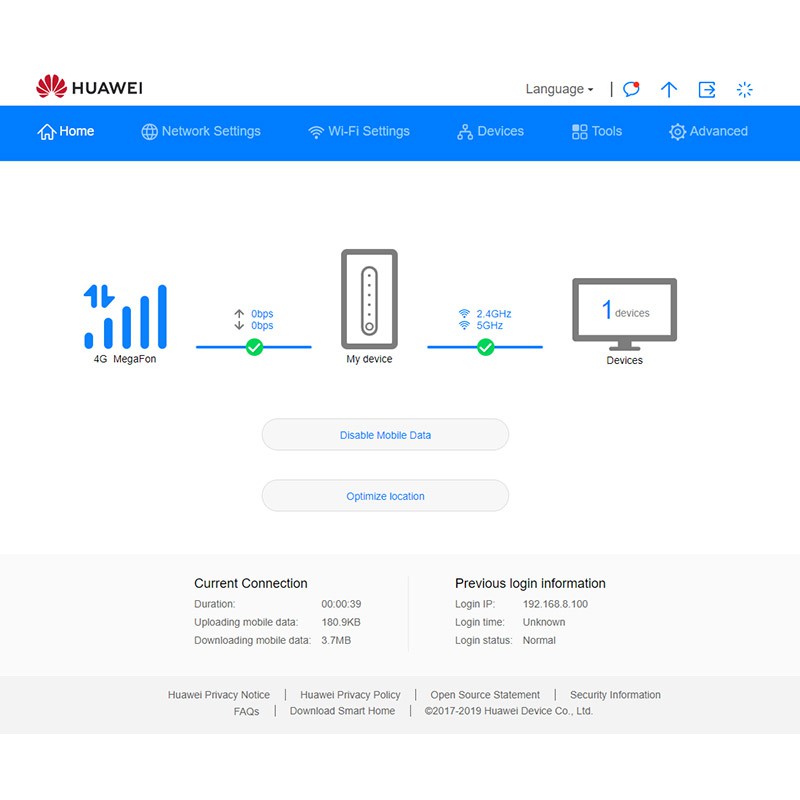 Также на задней панели роутера доступны два гигабитных разъема Ethernet (100/1000 Мбит/с) для подключения компьютеров, ноутбуков и других устройств по сетевому кабелю. Один порт служит только для подсоединения локальных устройств (LAN), второй является совмещенным портом LAN/WAN и может использоваться для кабеля провайдера. Эта опция позволяет зарезервировать интернет-соединение или выходить в сеть поочередно с помощью SIM-карты или обычного интернет-провайдера.