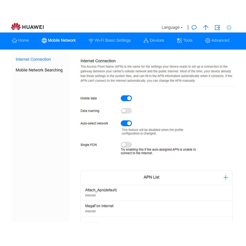Роутер оснащен сервисным WiFi-модулем (на частоте 2,4 ГГц) и может настраиваться с помощью обычного смартфона или планшета. Производитель подчеркивает, что WiFi-сеть роутера предназначена в первую очередь для конфигурации устройства, а не для общего доступа к мобильному интернету. Изменение параметров осуществляется через веб-интерфейс или фирменное приложение Huawei.