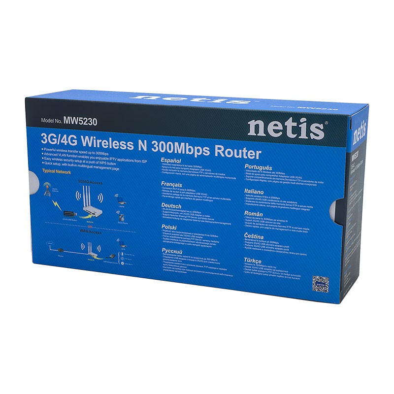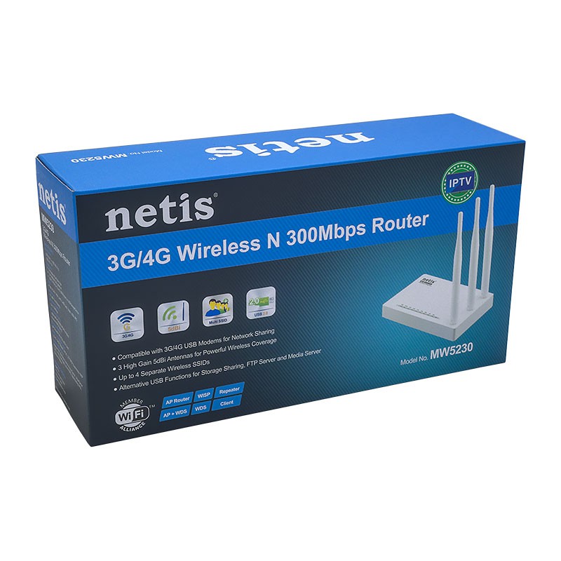 Netis MW5230 — недорогой домашний WiFi-роутер, к которому можно подключить кабель провайдера или 4G-модем. Максимальная скорость работы беспроводной сети на частоте 2,4 ГГц достигает 300 Мбит/с, что позволяет рекомендовать эту модель для городской квартиры, небольшого офиса или загородного дома. Благодаря поддержке популярных USB-модемов, прибор обеспечит привычный комфорт работы в интернете даже в отсутствии доступа к кабелю интернет-провайдера.