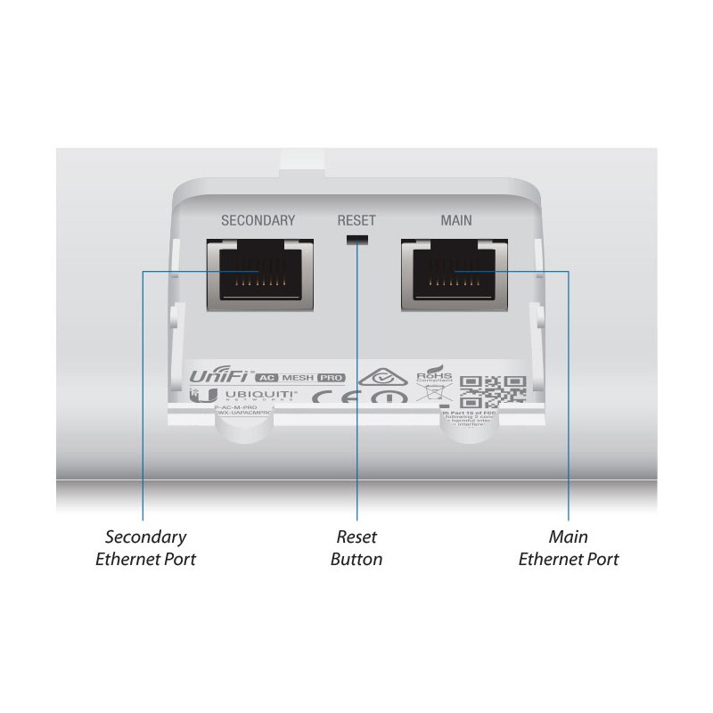 UniFi AC Mesh Pro оснащен двумя гигабитными Ethernet-портами. Питание к точке доступа подается через основной порт Ethernet, PoE-адаптер входит в комплект поставки. Заметим, что новое поколение устройств Ubiquiti поддерживает стандарт PoE 802.3af (48В). Отказ от собственной реализации Passive PoE в пользу общепринятого стандарта позволяет использовать точку доступа с любым совместимым PoE-свитчем, в том числе с фирменным UniFi Switch. Гигабитное подключение обеспечит идеальную скорость передачи данных до маршрутизатора, а поддержка технологии Power over Ethernet решит все проблемы с подачей питания.