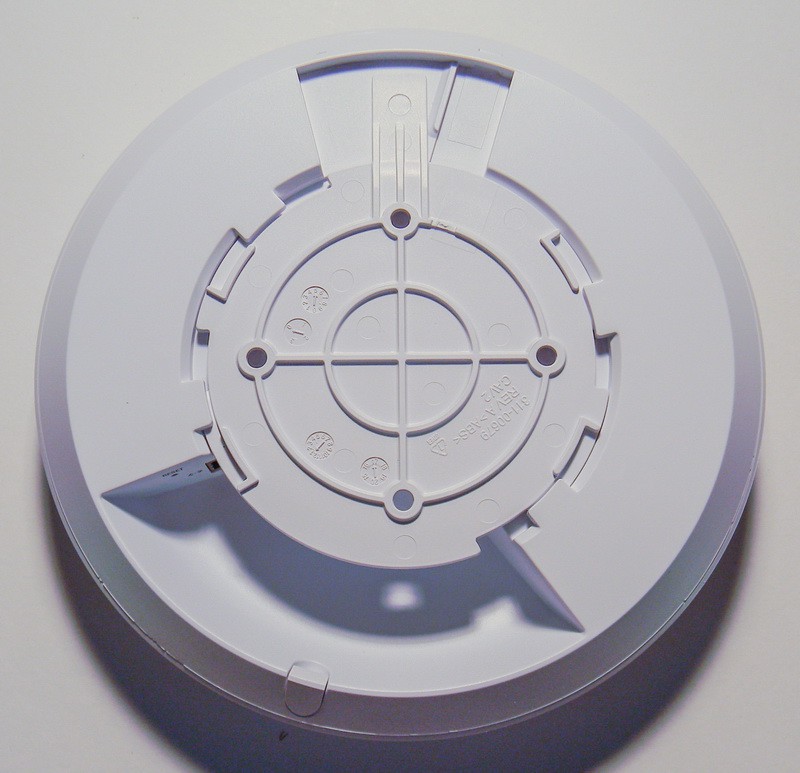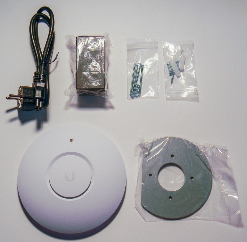 Коробка идет со всем необходимым, чтобы можно было сразу развернуть беспроводную сеть и начать ей пользоваться. Ubiquiti UniFi AC LR AP очень похожа на гладкий детектор дыма и гармонично смотрится в комнате. Сверху устройства есть хромированная эмблема Ubiquiti с небольшим кольцом вокруг, которое можно выключить при желании. На нижней стороне расположен 10/100/1000 Гбит/с порт Ethernet и кнопка сброса, они находятся в углублении для удобства подключения. Это позволяет устройство плотно закрепить на стену или потолок после подключения. Необходима маленькая отвертка для того, чтобы открыть замок крепления (это защитит от возможных краж, не получится просто снять устройство и уйти с ним).