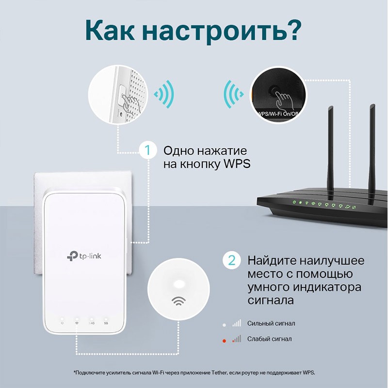 Примечание: Если ваш роутер не поддерживает WPS, подключите усилитель Wi-Fi сигнала к роутеру через мобильное приложение Tether или веб-интерфейс.