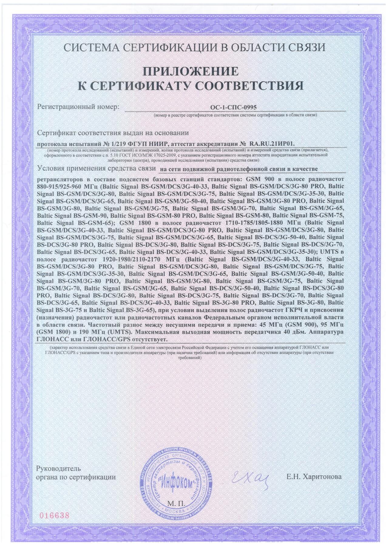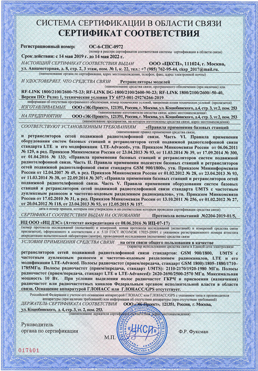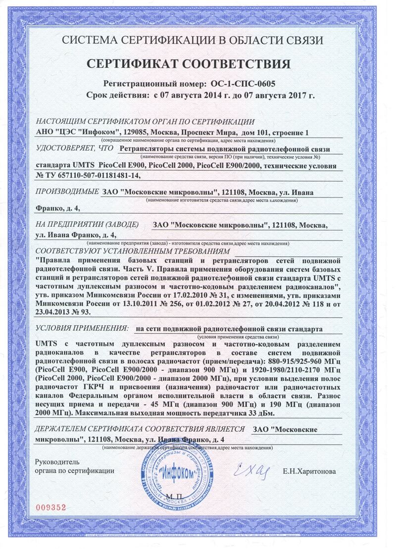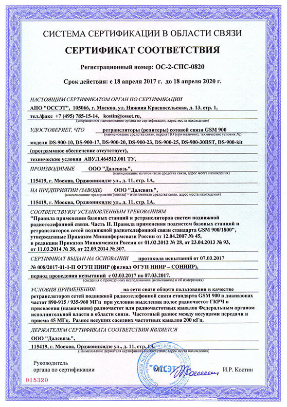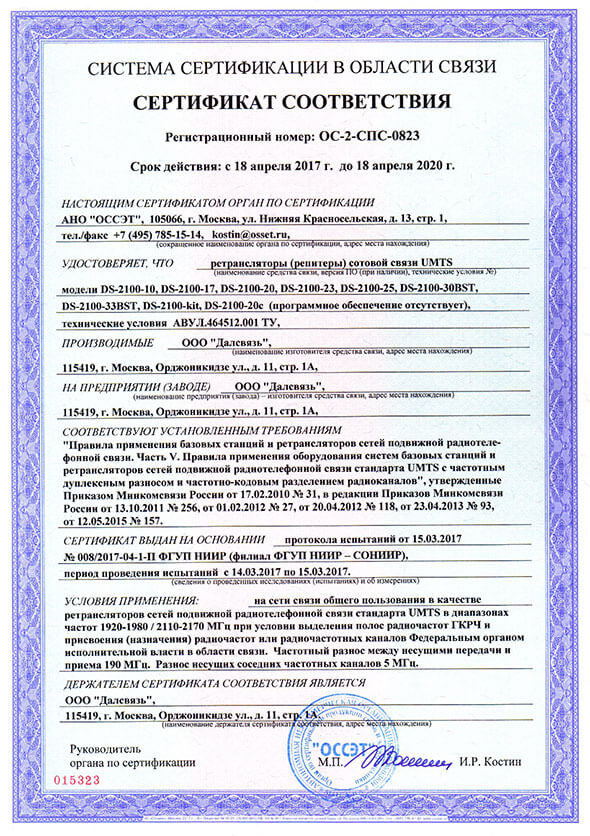 Все крупнейшие отечественные производители репитеров сотовой сети имеют сертификаты в области связи, что гарантирует их соответствие установленным правилам и требованиям Минкомсвязи. Приобретая продукцию нижеприведенных производителей, вы можете быть уверены, что покупаете сертифицированное оборудование!